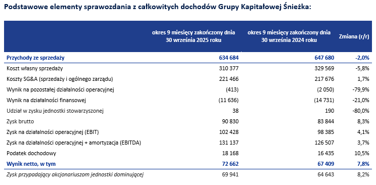 Po trzech kwartałach 2025 r. Grupa Śnieżka osiągnęła 634,7 mln zł przychodów ze sprzedaży, co oznacza spadek o 2,0% r/r. Mimo słabszych przychodów poprawiły się zyski: EBITDA wzrosła o 3,7% r/r do 131,1 mln zł, a zysk netto o 7,8% r/r do 72,7 mln zł.